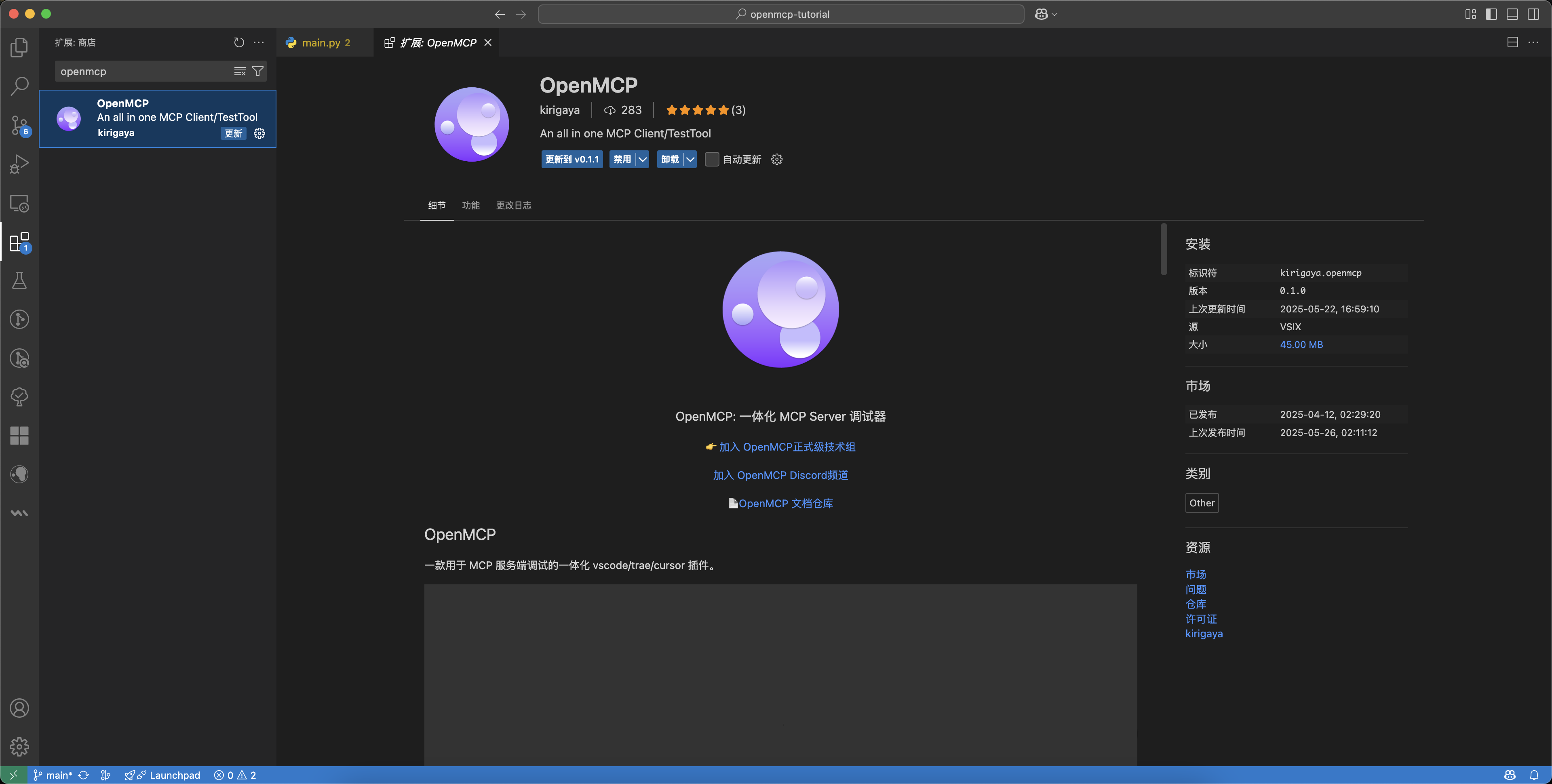 主要なVLEのプラグインストアで直接OpenMCPプラグインを入手できます。例えばVSCodeでは、左側のプラグインストアをクリックし、検索ボックスにOpenMCPと入力するとOpenMCPプラグインが見つかります。