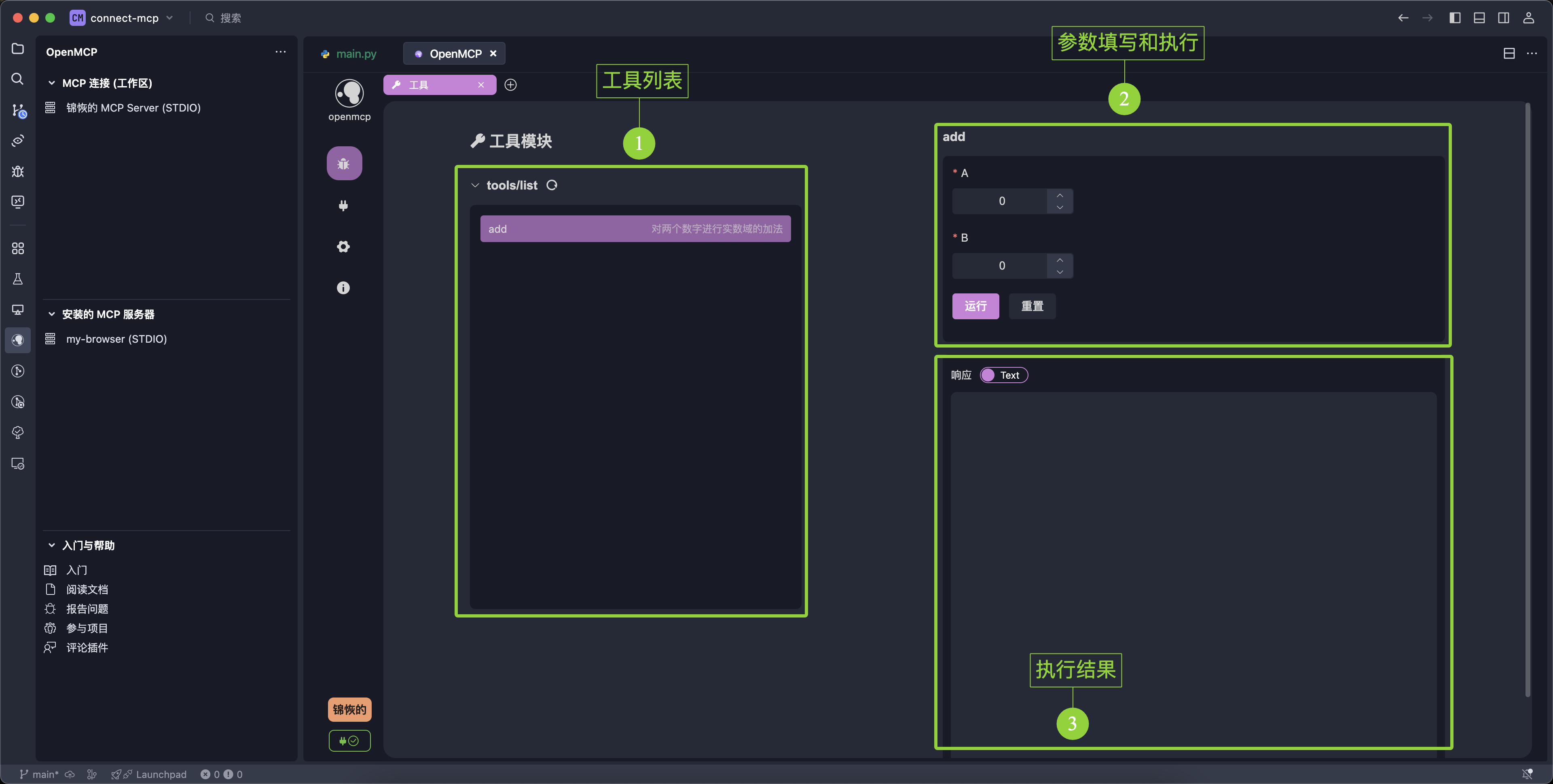 次に、このサーバーの機能をデバッグできます。結局のところ、Jeaf Deanのように誰もが一度で全てのコードを正しく書けるわけではありません。私たちが作成するMCPサーバーも、最初から自信を持って公開できるものばかりではなく、常に私たちが気付かない問題が存在します。想像してみてください、後でmcpを大規模モデルに接続して全リンクのデバッグを行う際に問題が発生した場合、その時には非常に多くのエラー要因が考えられることに気付くでしょう:MCPサーバーの問題?大規模モデルベンダーの問題?OpenMCPの問題?可能性のあるエラーを分類し、一つずつ調査することが、エンジニアリングの直感(Engineering Instuition)に適った方法です。