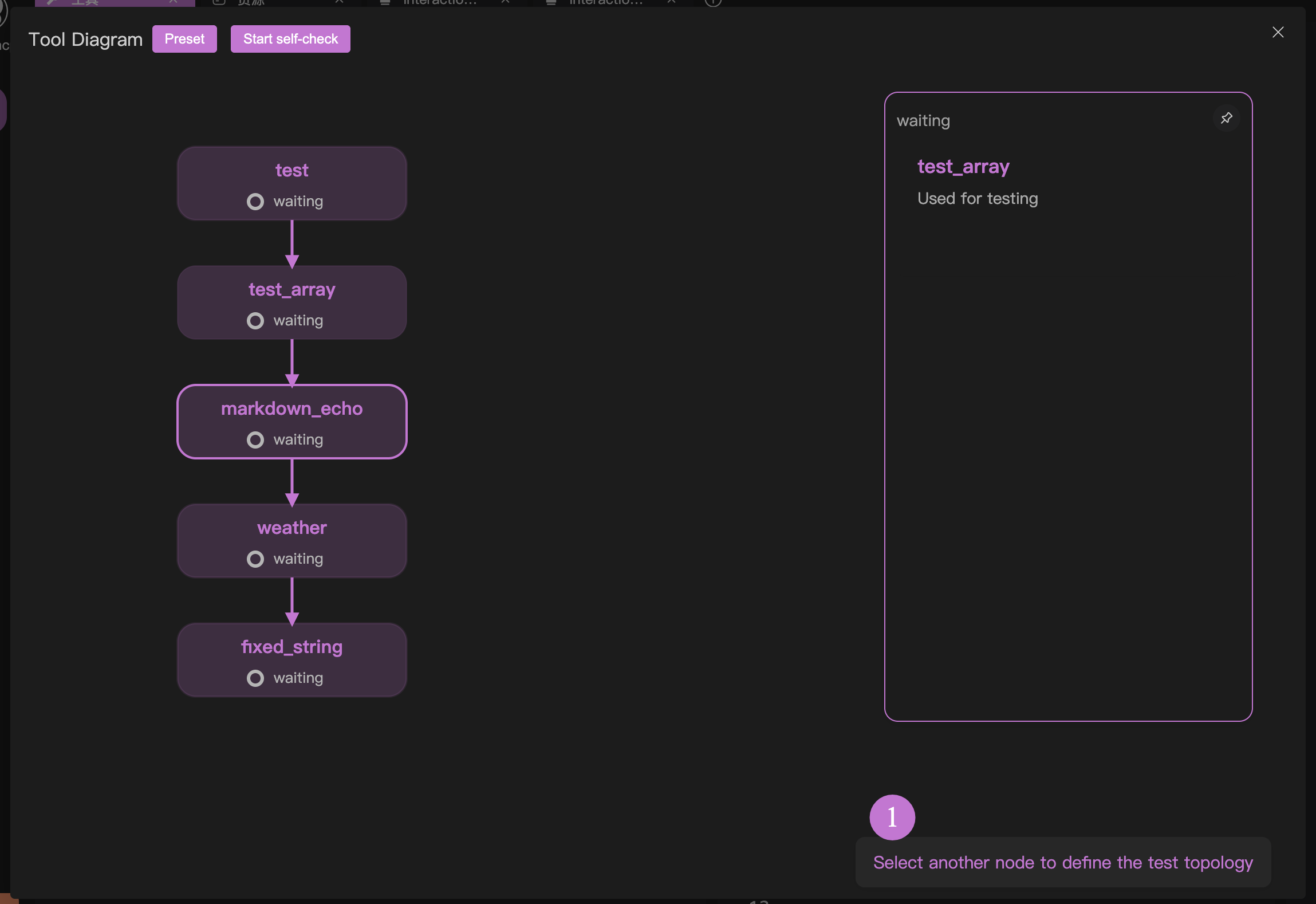 自動診断プログラムでは、テスト順序を定義する必要があります。これにより、自己診断プログラムは設定したテスト順序(後で実行トポロジーと呼びます)に従って自動実行します。これは、ほとんどの場合、MCPサーバーのツールには一定の依存関係があるためです。例えば、PPTを作成するMCPを開発した場合、「ページを追加」というツールは「PPTを作成」というツールの後に実行する必要があります。