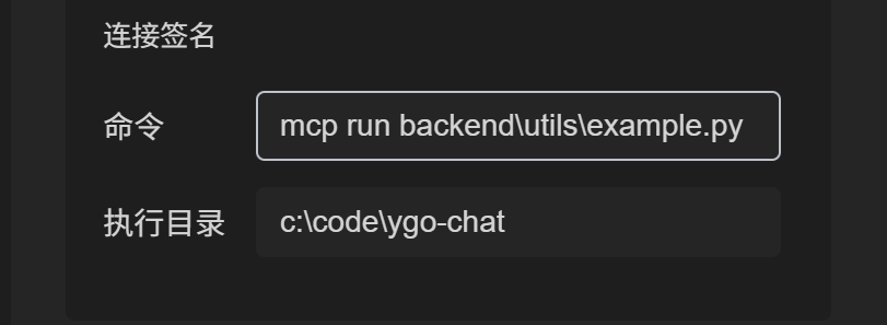 C:\code\ygo-chat\.venv\Scripts\python.exe example.pyNote: This method also applies to the command field for node or mcp instructions, as well as other MCP client configuration files.
