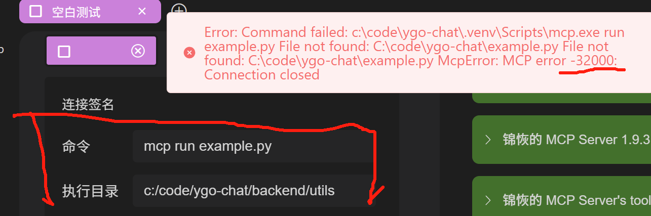 When using OpenMCP, you may sometimes encounter situations where the virtual environment (venv) and the Python file are not located in the same directory, or the virtual environment might even be outside the project folder. In such cases, clicking the connect button on the top right may result in an MCP connection failure (Error Code: 32000).