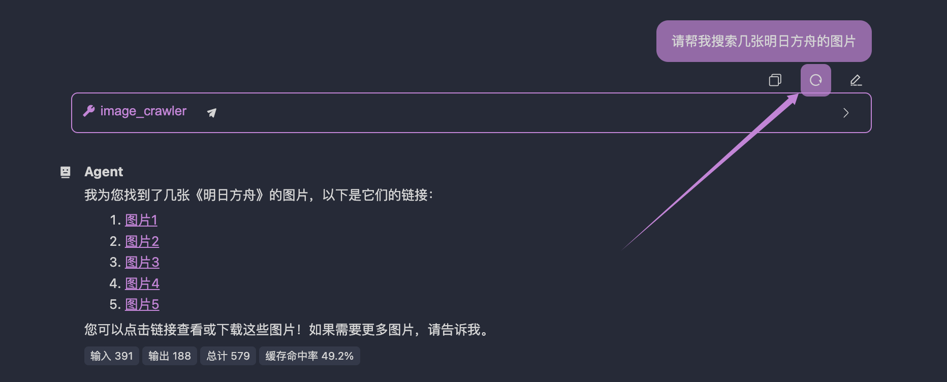 Next, move your cursor to the first user message box. Several buttons will appear—click the Re-run button to re-execute that conversation turn: