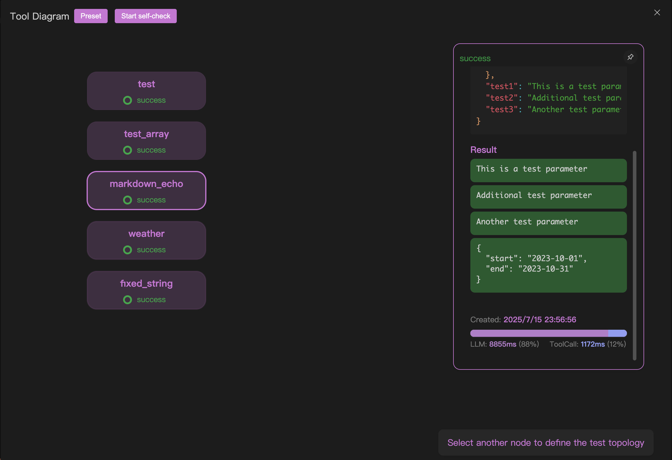 For an overview of the MCP tool self-check procedure, you can watch this video: OpenMCP 0.1.9 Update Log: Supports self-checking of MCP tools & Custom topology sorting