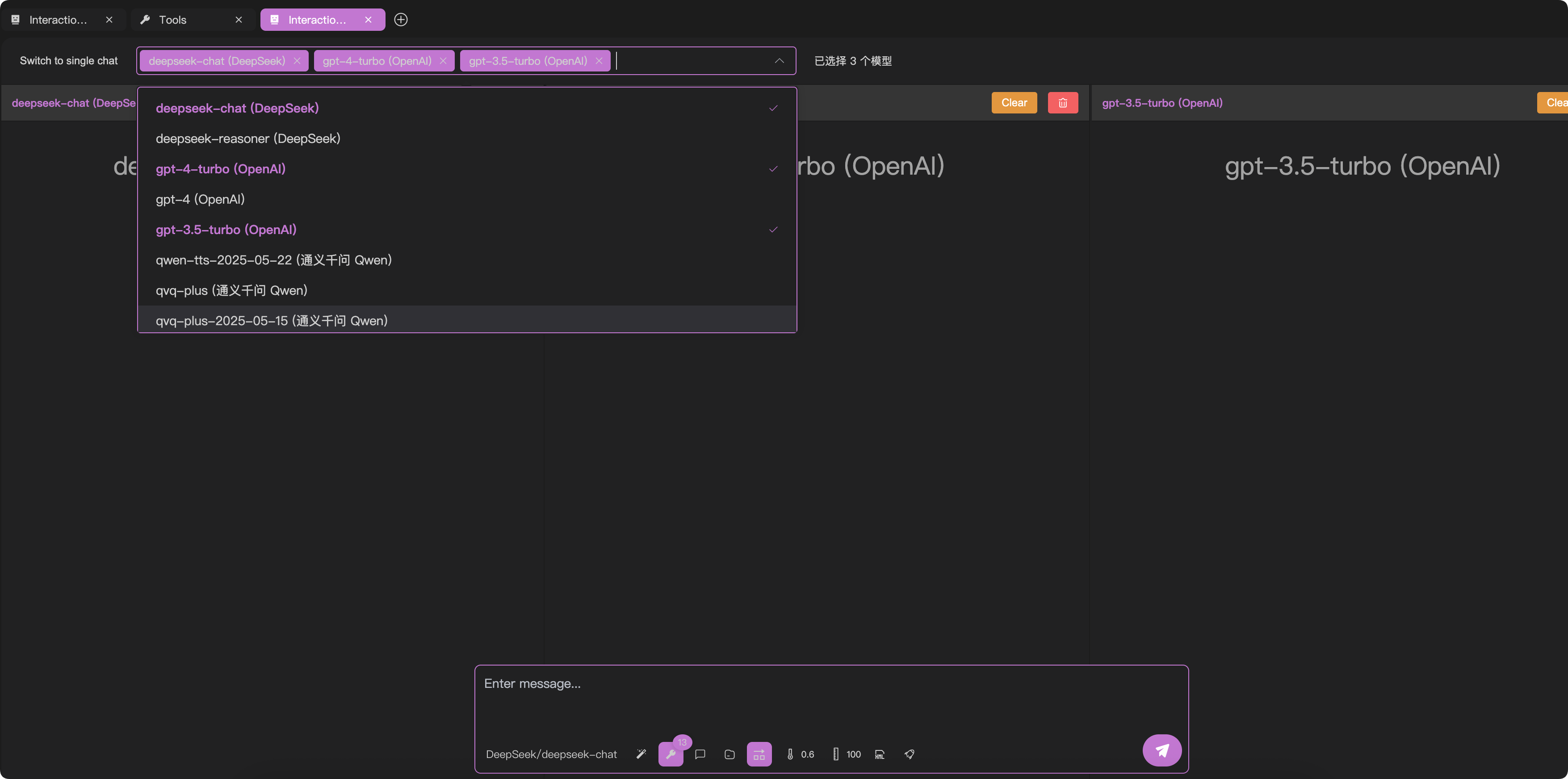 In interactive testing, you can click the button in the upper left corner to switch to parallel testing. Here, you can test multiple large models simultaneously with one question.