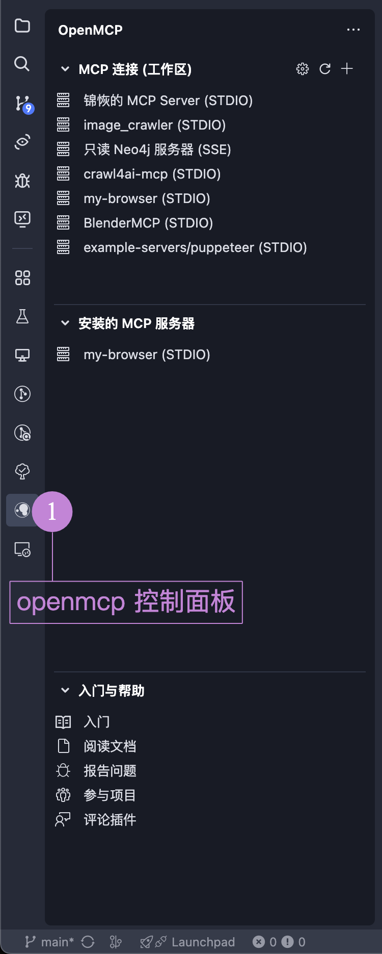 在 VLE 的左侧可以找到 openmcp 的图标,点击后就是 openmcp 的控制面板。